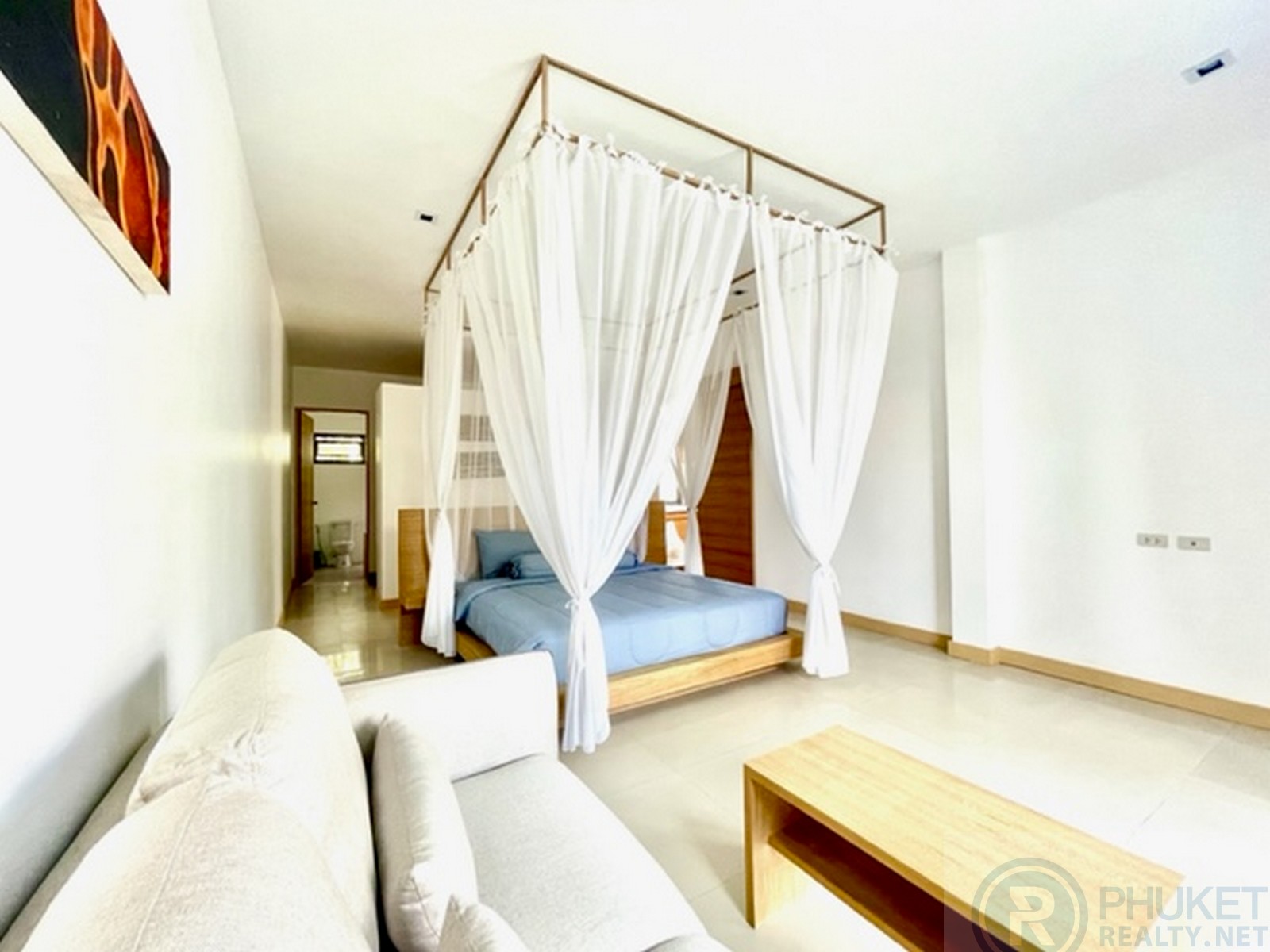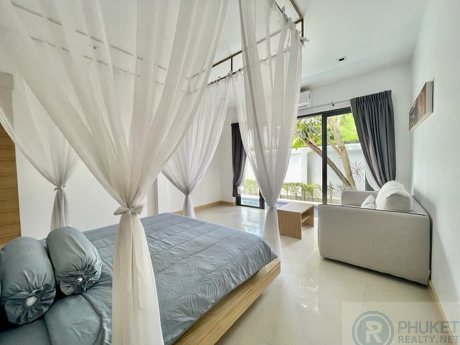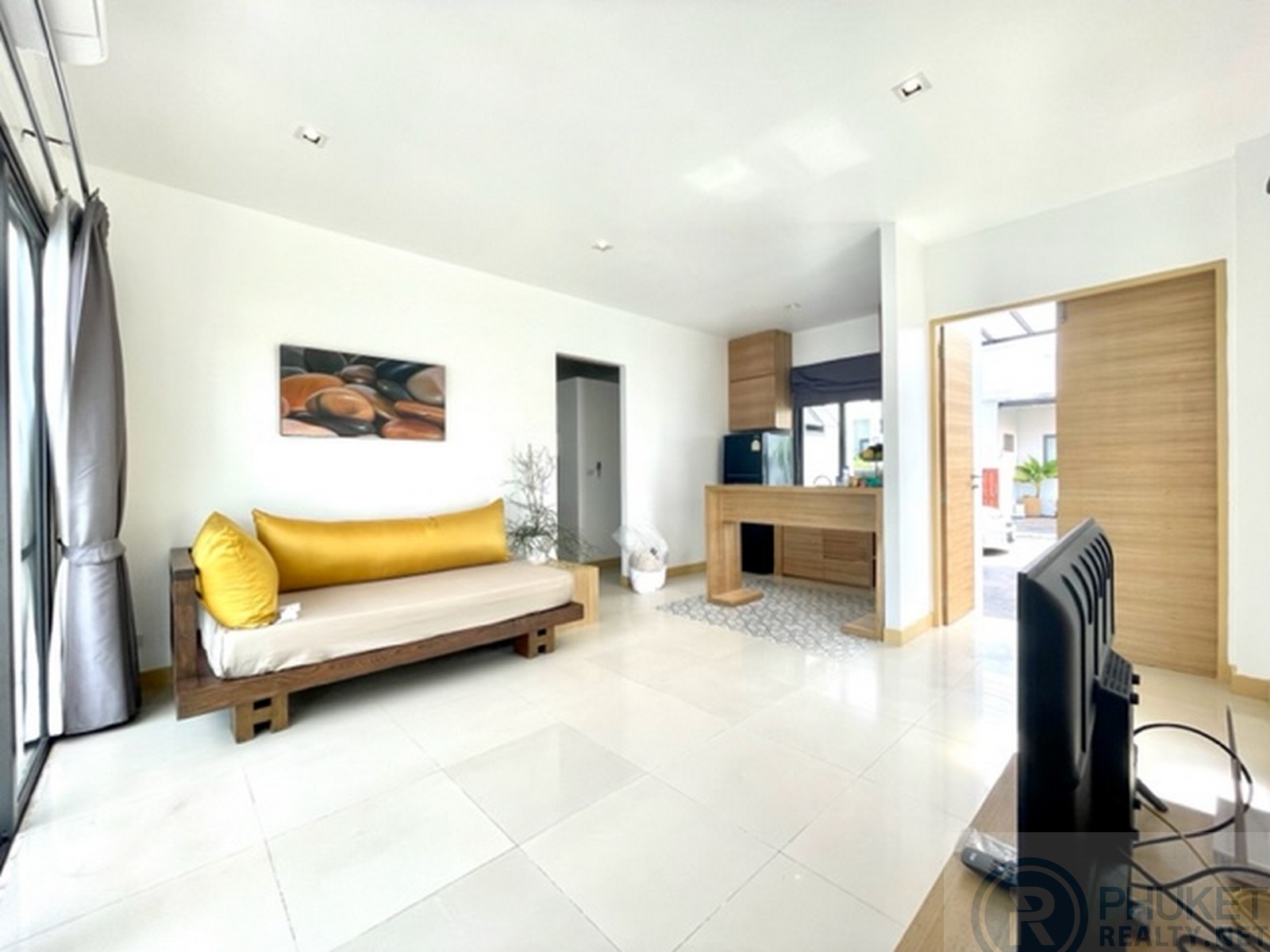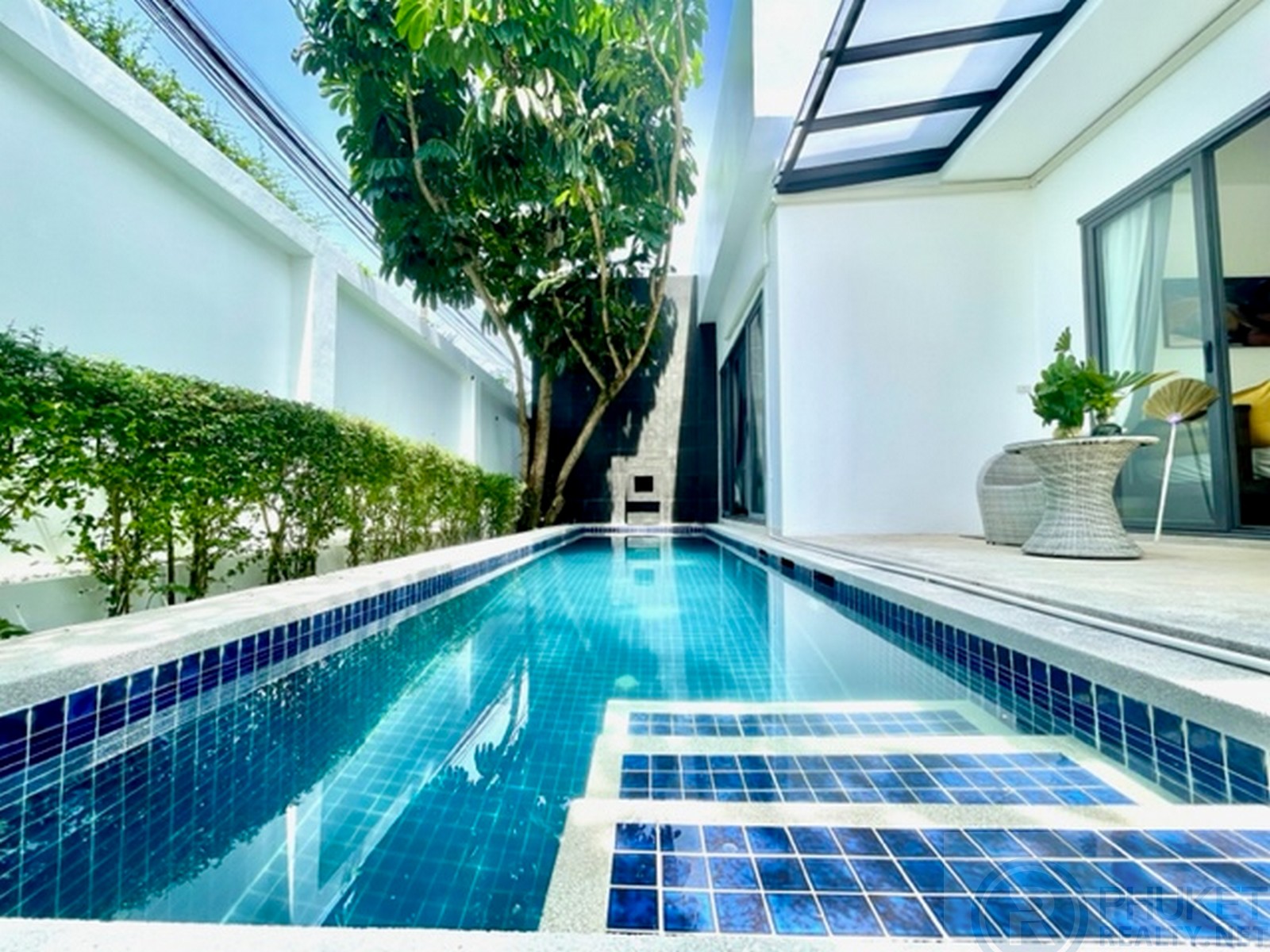 This modern one bedroom villa offers a 9 meter lap pool, office/media room, walk-in wardrobe, open-air rain shower, carport, fully fitted kitchen with furniture and accessories - ready to move in. The oversize bedroom with four poster bed looks out over the swimming pool and garden area. The bedroom has a sofa, coffee table and flat-screen tv and dvd player. The enormous bathroom includes a bathtub and an open-air rain shower which just adds to the luxury. The living area is fully furnished, with artwork, flat-screen TV, DVD player, sofa and coffee table, also looking out over the terrace, pool and garden area. Outside the terrace has relaxing lounge sofa's for outdoor entertaining and star gazing. Being located in the central Laguna area means the property benefits from an array of activities and amenities, including sandy white beaches, water sports, tennis, golf, international and Thai restaurants, spas and an extensive local expat community.