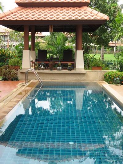 The private pool is in the centre of the garden, surrounded by a BBQ area and an under roof Thai Sala.