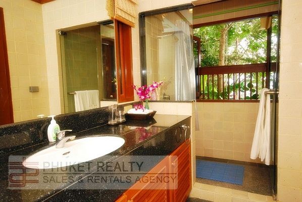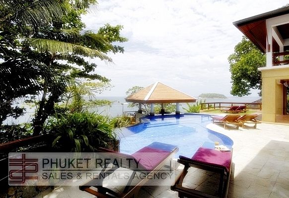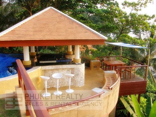 This delightful villa is ideal for either a relaxing getaway or great parties. The pool has a swim up bar which allows you to sit in the pool with a cocktail in hand and watch the sunset across the Andaman Sea in front of you. The villa has been built on three levels sloping down to the sea. Each level has excellent views out to sea. There are bedrooms on each level with the swimming pool located on the lower level along with the bar, one bedroom and the entertainment room. The villa consists of three buildings, one with three bedrooms on two levels, one with the entertainment room, dining/sitting room and pantry also on two levels and the third building has the servants quarters and main kitchen hidden on the lower floor behind raised flower beds with the upper level given to one bedroom and a large covered veranda.