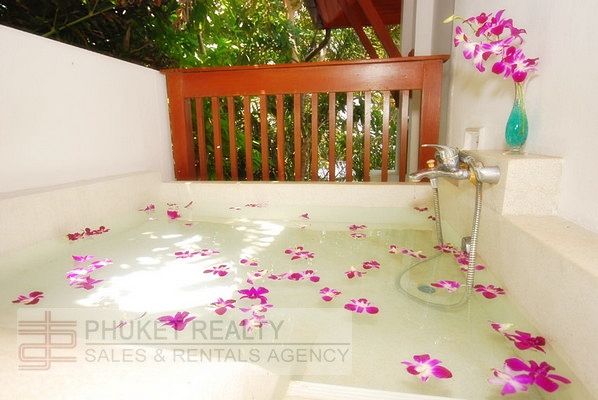 This large bedroom with a king-size bed is Thai style with wooden floor and vaulted ceiling. A private balcony overlooks the swimming pool, facing west across the Andaman Sea. The room has large cupboards with a room safe and vanity desk with a magnified make-up mirror. En-suite toilet and shower are complimented by a rather impractical outdoor terrazzo bathtub.