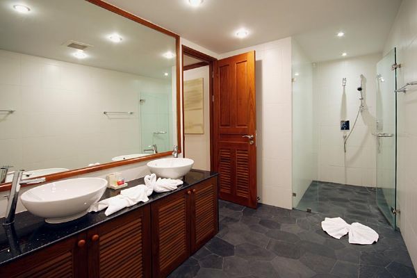 The lower level of the villa houses two master suites with ensuite bathroom. The bathrooms are spacious with separate toilet and shower areas and whirlpool baths positioned to capture the views. The second master suite also has a private terrace. The third bedroom is a triple room with twin beds and a bunk. The fourth bedroom is a single. Both these rooms have adjoining bathrooms with toilet and shower.