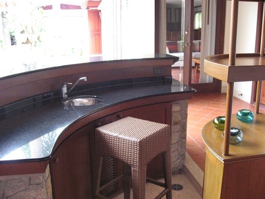 A huge central living area compromising an open dining and living room with pitched ceiling, overlooks the terrace, pool and gardens. The concertina glass doors running the length of this area, give access directly onto the pool terrace, and when opened create that special tropical ambiance for entertaining.