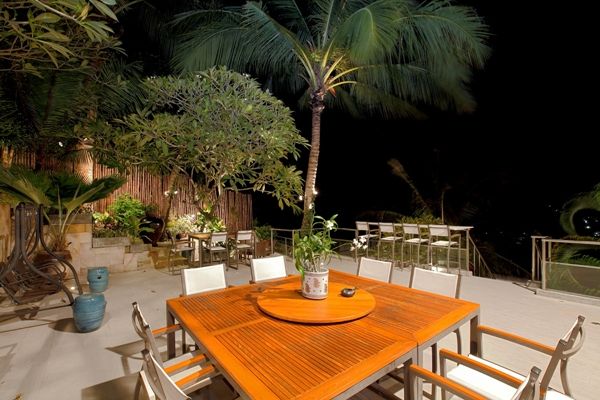 The living area is in its own pavilion overlooking the pool terrace, and includes quality furnishings and artifacts. The indoor dining can seat up to 14 people. Located in the same pavilion as the fully equipped modern kitchen. The staff will cook Thai meals in a separate area of the villa to allow guests continual access to the kitchen. Outdoor dining is very abundant, and can seat up to about 50 people in total.