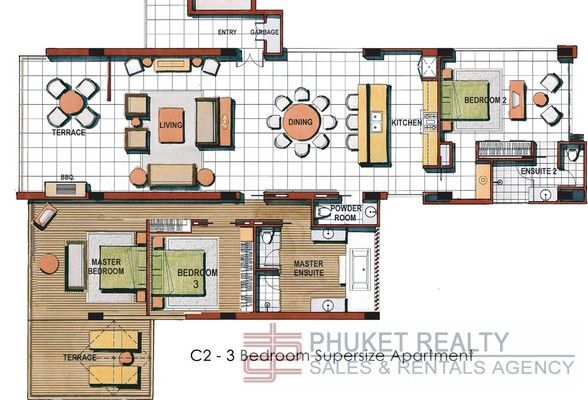 Treat yourself to the ultimate Super sized Family Three Bedroom Apartment at a spacious 250 square metres overlooking the pool area, with 3 bedrooms, 2.5 bathrooms- main with a huge bathtub, 2 outdoor terraces, fully equipped kitchen including full sized fridge, dishwasher, and washing machine/dryer, huge living space with 50″ TV and DVD, iPod dock for all of your music, spacious sofas, dining table for all the family, and TV?s in each bedroom. Third bedroom can be configured as either King or twin beds. Perfect for 6 persons there is abundant space for everyone to spread out and relax. For the very best in Surin Beach Accommodation this is the place to be- 1 only available