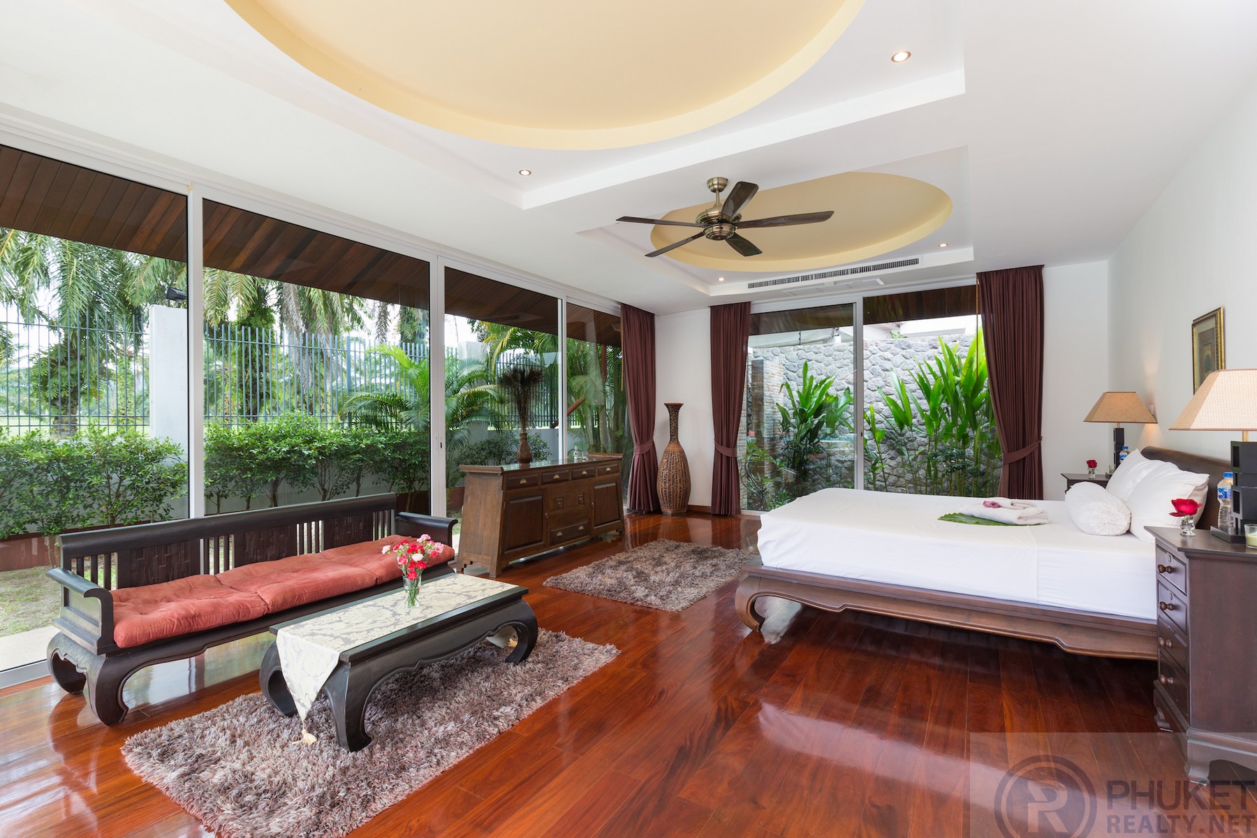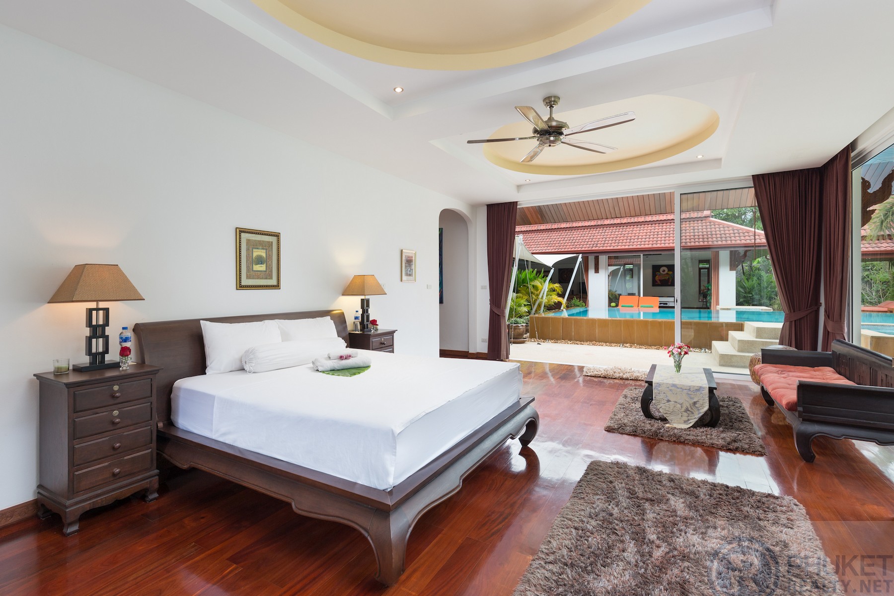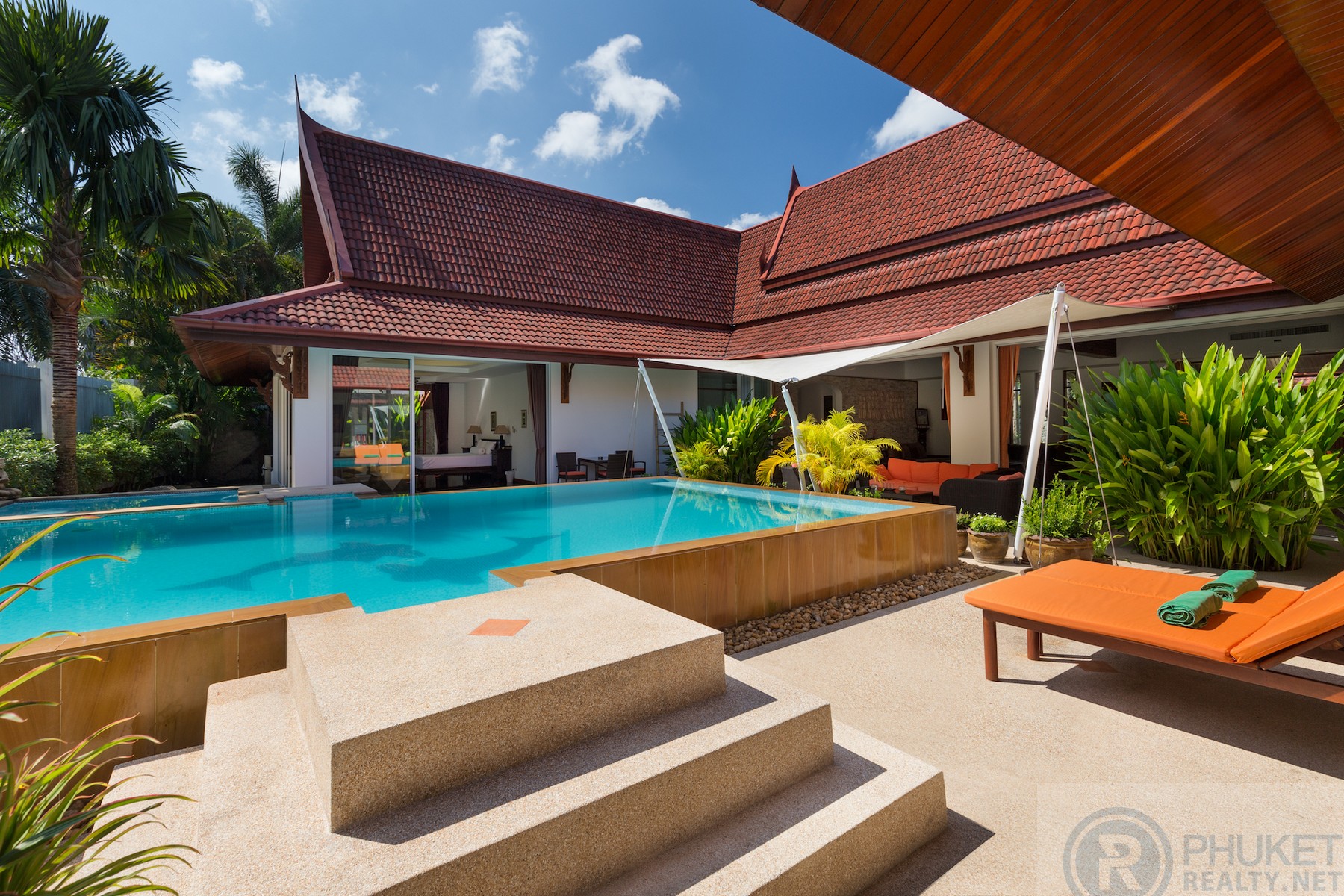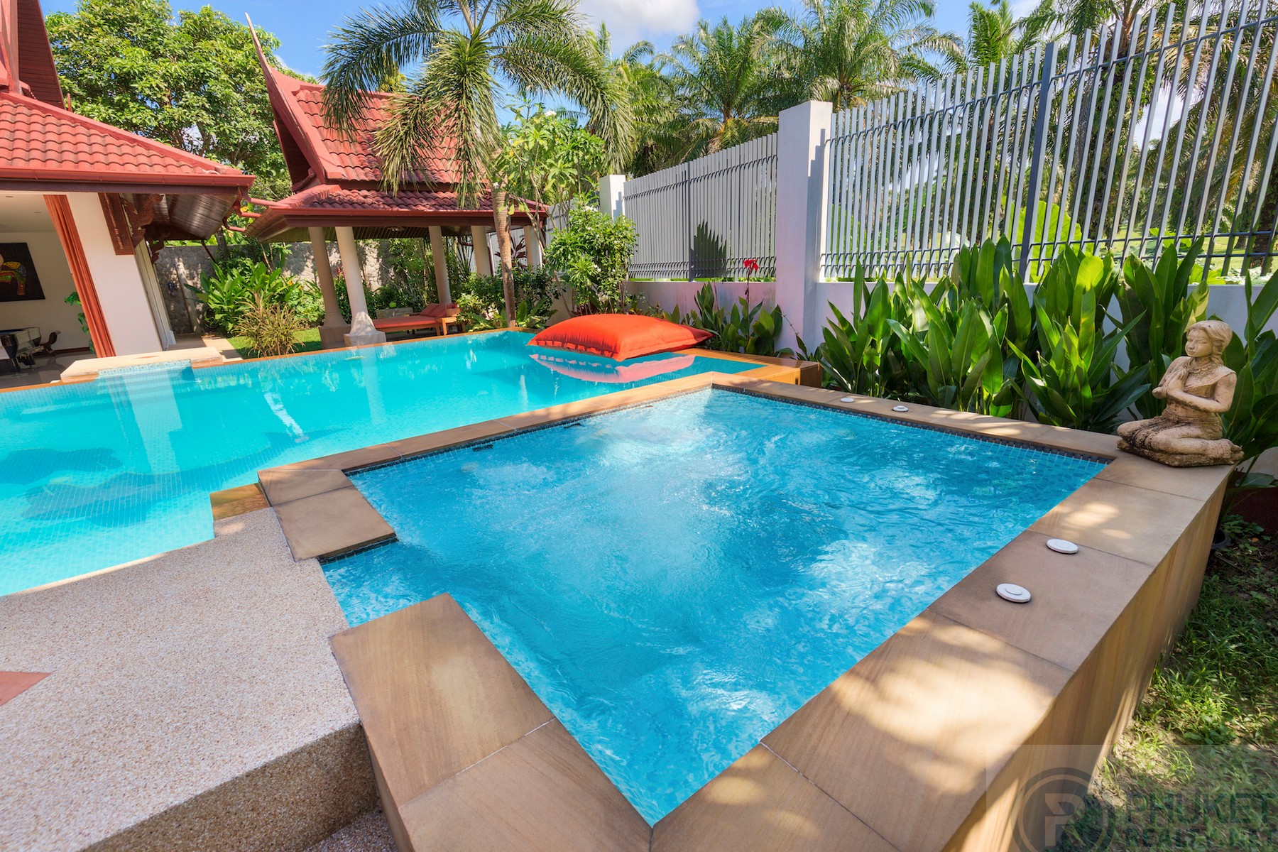 Beautifully maintained and presented U-shaped pool villa fronting onto Kathu Golf Course in the heart of the island. Easily accessible to all parts of the island.The villa is very accessible for International schools, Phuket’s main shopping centres and only 15 minutes to Marinas and Patong.The villa is in a bungalow style with distinctive vaulted Thai style roofing.The spaces in the villa are enormous with large open dining and twin living areas which open directly to the gardens and pool.Currently the villa is configured with 3 large bedrooms with private ensuite bathrooms. However, the design is such that the villa can easily be configured with 5 bedrooms all on the one level.The property is walled by a granite stone high wall which gives privacy and serenity to the villa itself.There is a twin car garage and space for two more cars in the parking area.Materials are all to a high standard, incising teak wood, easy to maintain ceramic tiling in the living areas and top-quality Sun Paradise window systems.The pool is the focus of much of the villa and has a built in jacuzzi at one end with separate massage and dining sala at the font of the villa on the other side of the pool.Currently owned by Thai Freehold of the 1,200 Sq.m land plot and foreign freehold of the villa structure.